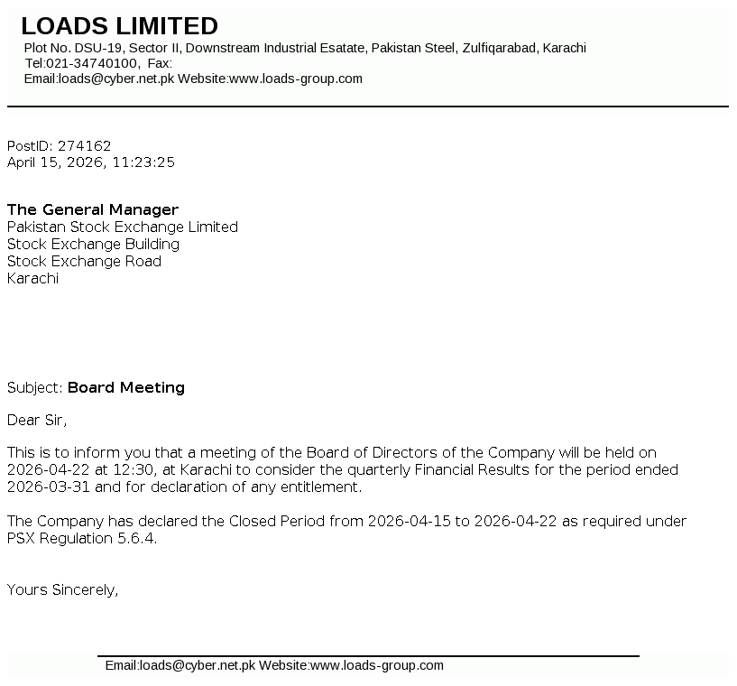 LOADS - Loads Ltd. PSX Stock Snapshot | Fundamentals ,Technicals and Market data (PE Book Value Trading Signals EPS ROE ROA)